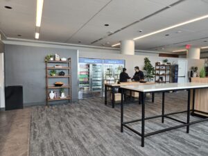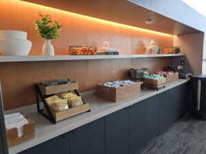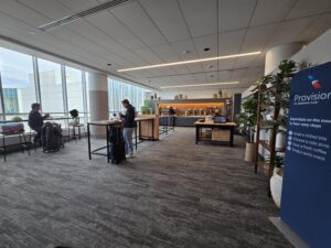 Provisions mainly offers a selection of sandwiches, salads, yogurts, snacks (chips, cookies, nut mixes), and beverages. It has limited seating, and unlike the lounges, there are no restrooms.