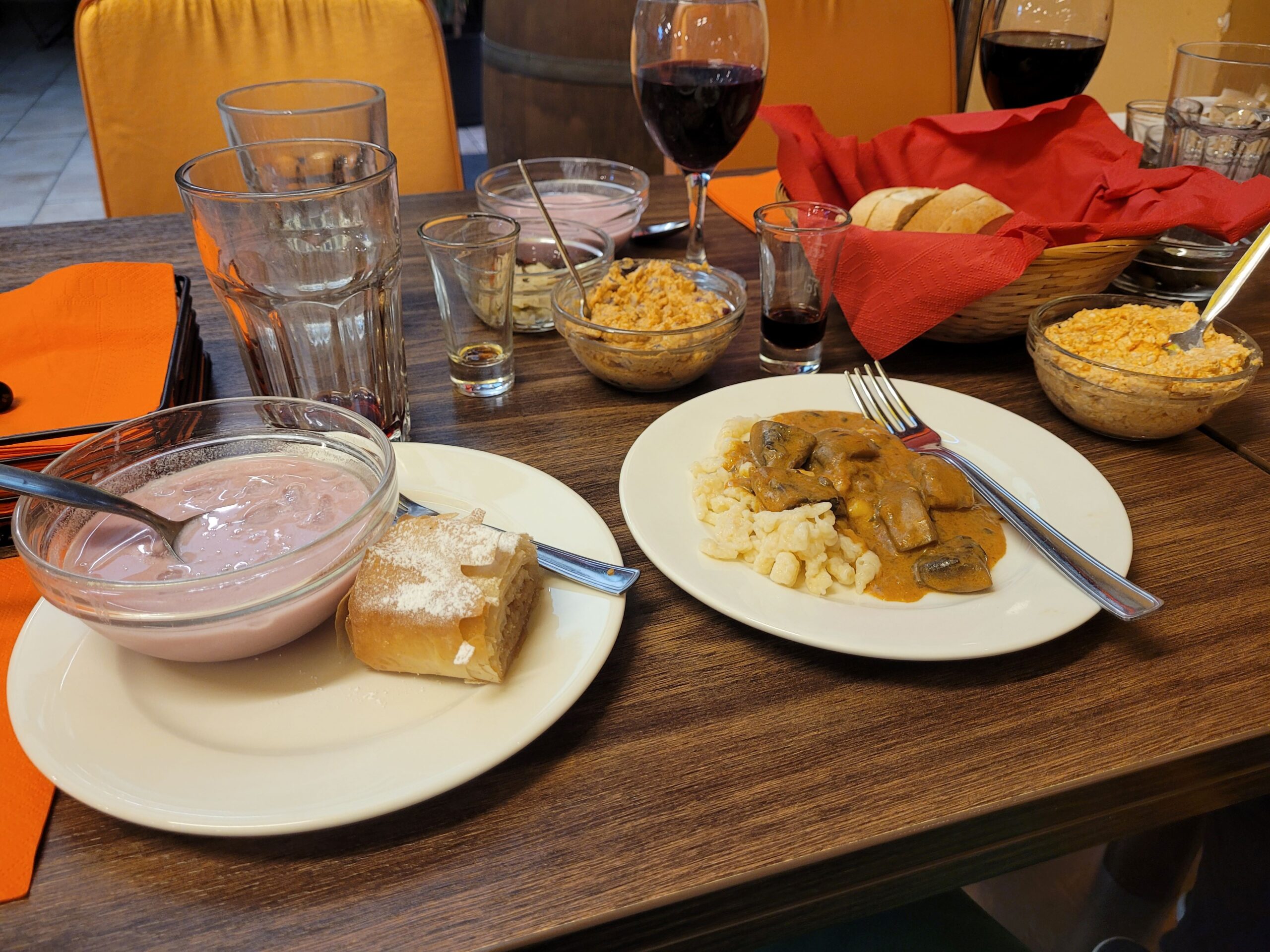 To start our cooking adventures, I was placed on the green team, which, in my opinion, was the best one – Go Team Apple Strudel! The other teams prepared cherry soup, two types of paprikash (one with meat and the other made with mushrooms), and the dumplings that accompany the paprikash. After we finished cooking, we had the opportunity to try the various dishes. To conclude our time at Chef Parade, we were gifted a Hungarian cookbook!