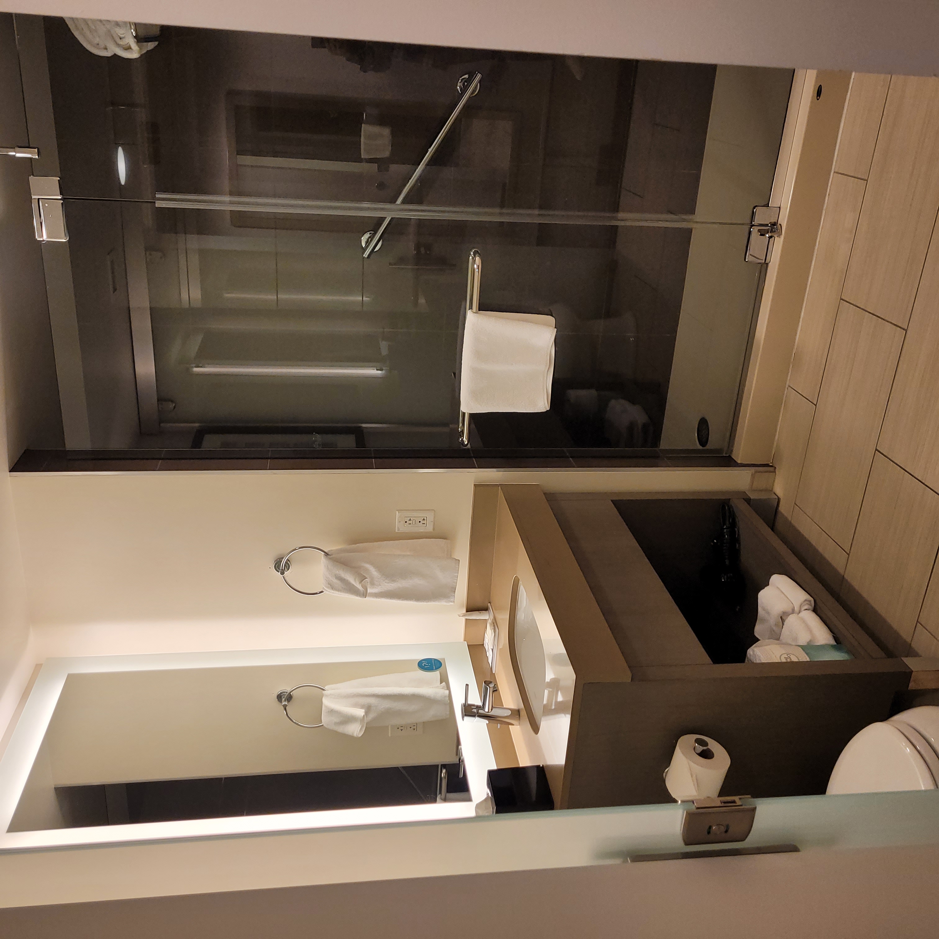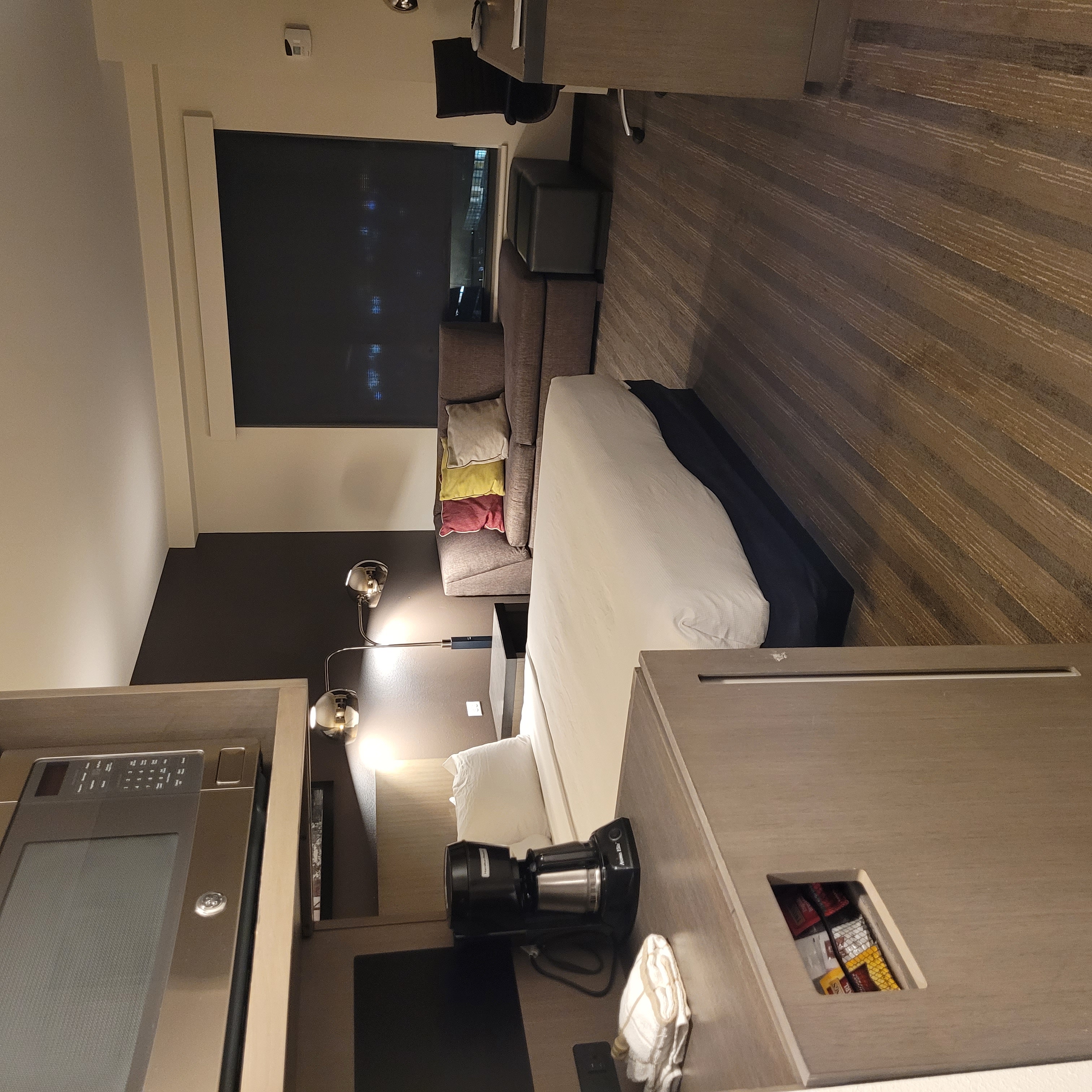 The Hyatt House Downtown offers spacious rooms with a king bed or suites that feature a kitchen and a sofa bed. The Hyatt House is located in the same building as the Hyatt Place, a property that offers standard rooms with either a king bed or two queen beds. My room at the Hyatt House Downtown was well-appointed and included a couch, microwave, fridge, coffee maker, and ironing board. There was also sufficient storage space.