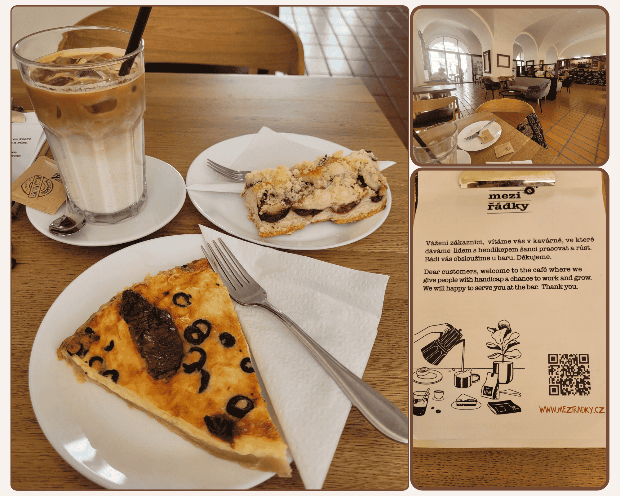 I found this café in between visits to the art galleries at Schwarzenberg Palace & Šternberský Palace. It was around lunchtime on a Saturday afternoon, and it was not crowded. I ordered an iced latte, a sundried tomato and black olive quiche, and a plum crumble. The quiche was absolutely delicious!!