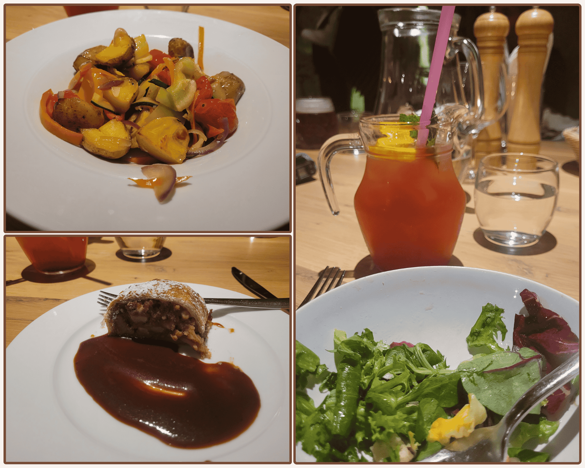 The group’s meal consisted of a drink, salad, entrée, and dessert. For a drink, I ordered my usual, a lemonade, and was given a flavorful raspberry lemonade. The vegetarian option was a bowl of roasted potatoes and veggies, and for non-vegetarians, dinner was the Svíčková, a traditional dish of braised beef with dumplings and cranberries. To end the meal, the group was treated to a dessert of apple strudel with plum and molasses puree. Overall, the meal was good, and the dessert was scrumptious; it was flavorful but not too sweet!
