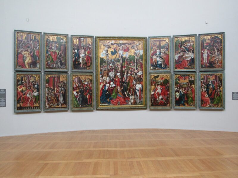 Standing before this altarpiece was one of the biggest wow moments of my trip. This is the Göttingen Altarpiece with the Passion of Christ painted by Hans Raphon. Today, only 13 of the estimated 41 panels exist. The left panels depict the events leading up to Christ’s death, while the right panels show the moments that followed. The middle panel portrays the Crucifixion of Christ.