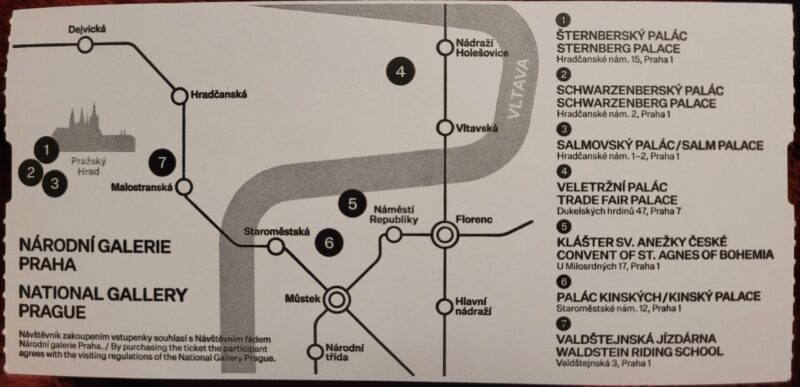 The Národní Galerie Praha charges a basic rate for each museum, plus reduced admission for those who qualify. The back of the ticket provides a handy map showing the location of each museum along with the closest metro stop. Of course, you can always walk or take one of the Prague trams.