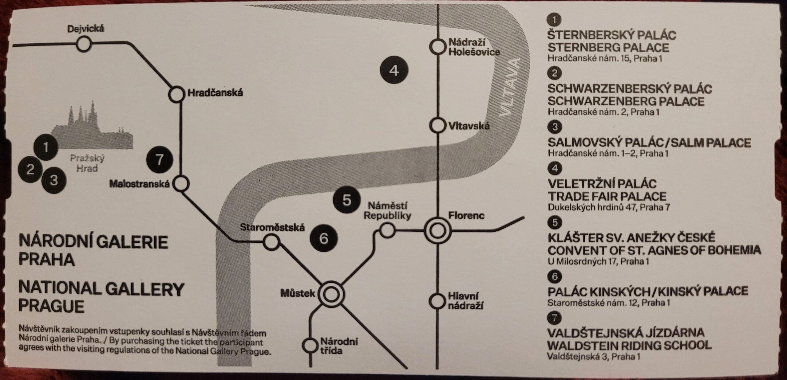 The Národní Galerie Praha charges a basic rate for each museum, plus reduced admission for those who qualify. The back of the ticket provides a handy map showing the location of each museum along with the closest metro stop. Of course, you can always walk or take one of the Prague trams.