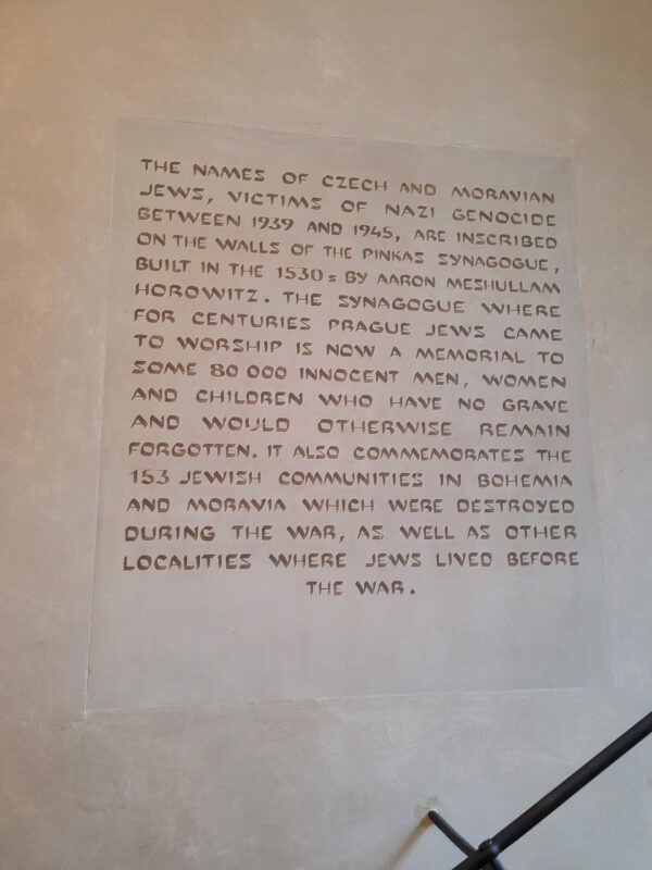 The walking tour of the Jewish Quarter was a great learning experience, given Honza’s excellent narration and the exhibits featured at each synagogue. The exhibits were well-curated, and some synagogues had stunning interiors. A moving moment of the tour was the stop at the Pinkas Synagogue. Here, one comes across a heartbreaking scene: etched on its stone walls are the names of thousands of Jews, many from the same family, who were killed in the Holocaust.